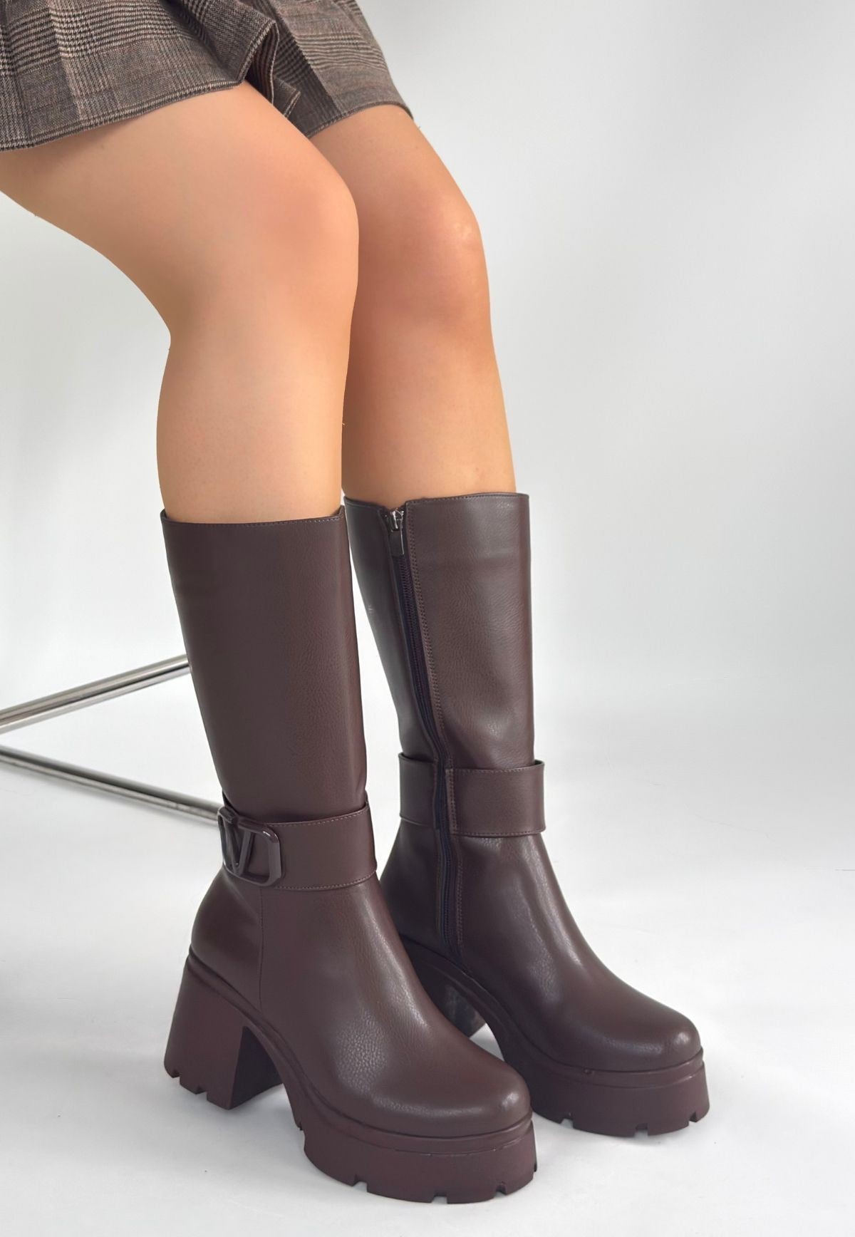 Çizme Moki Kahverengi Cilt Topuklu Çizme