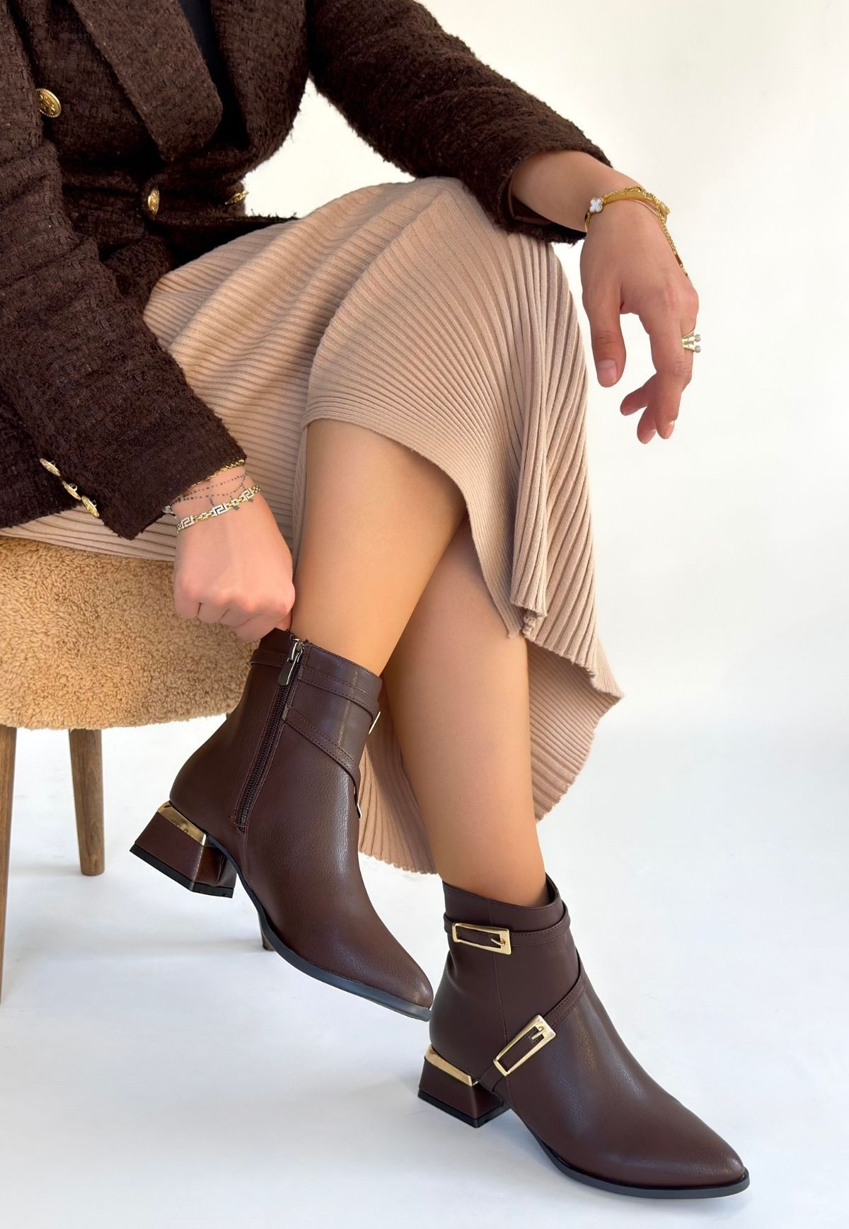 Kadın Ayakkabı İnay Kahverengi Cilt Topuklu Bot