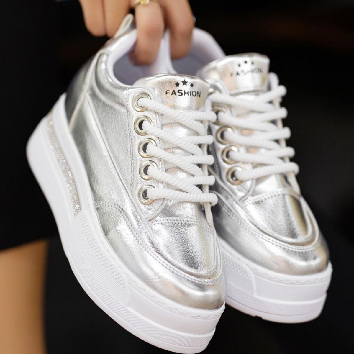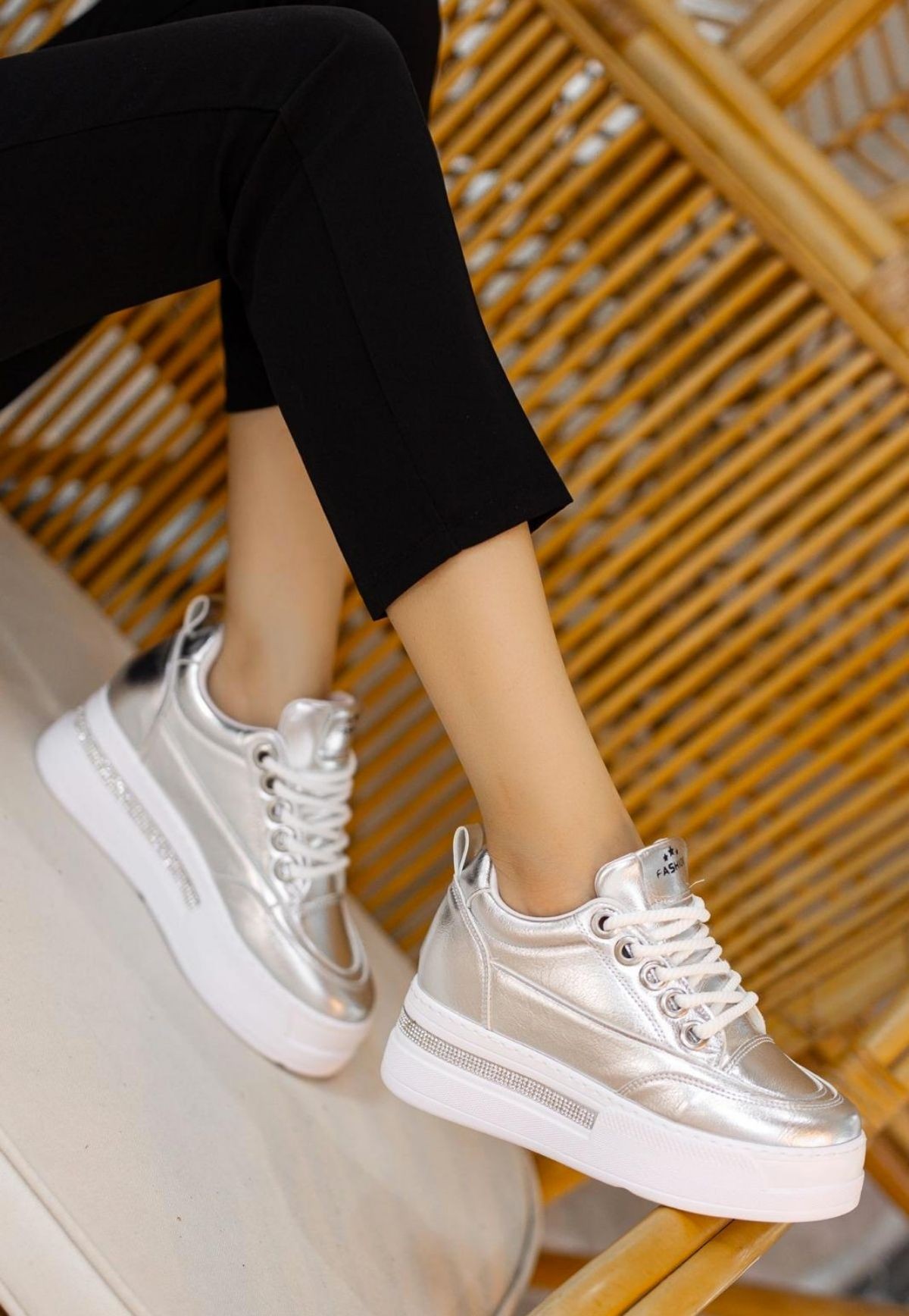 Kadın Spor Lulu Gümüş Rugan Bağcıklı Spor Ayakkabı
