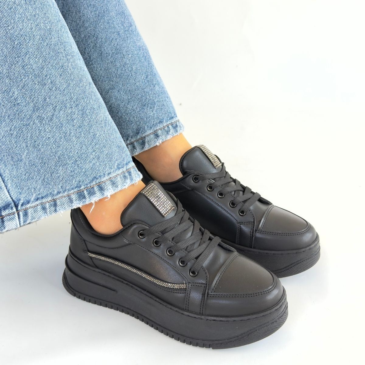 • Natte Siyah Cilt Bağcıklı Spor Ayakkabı