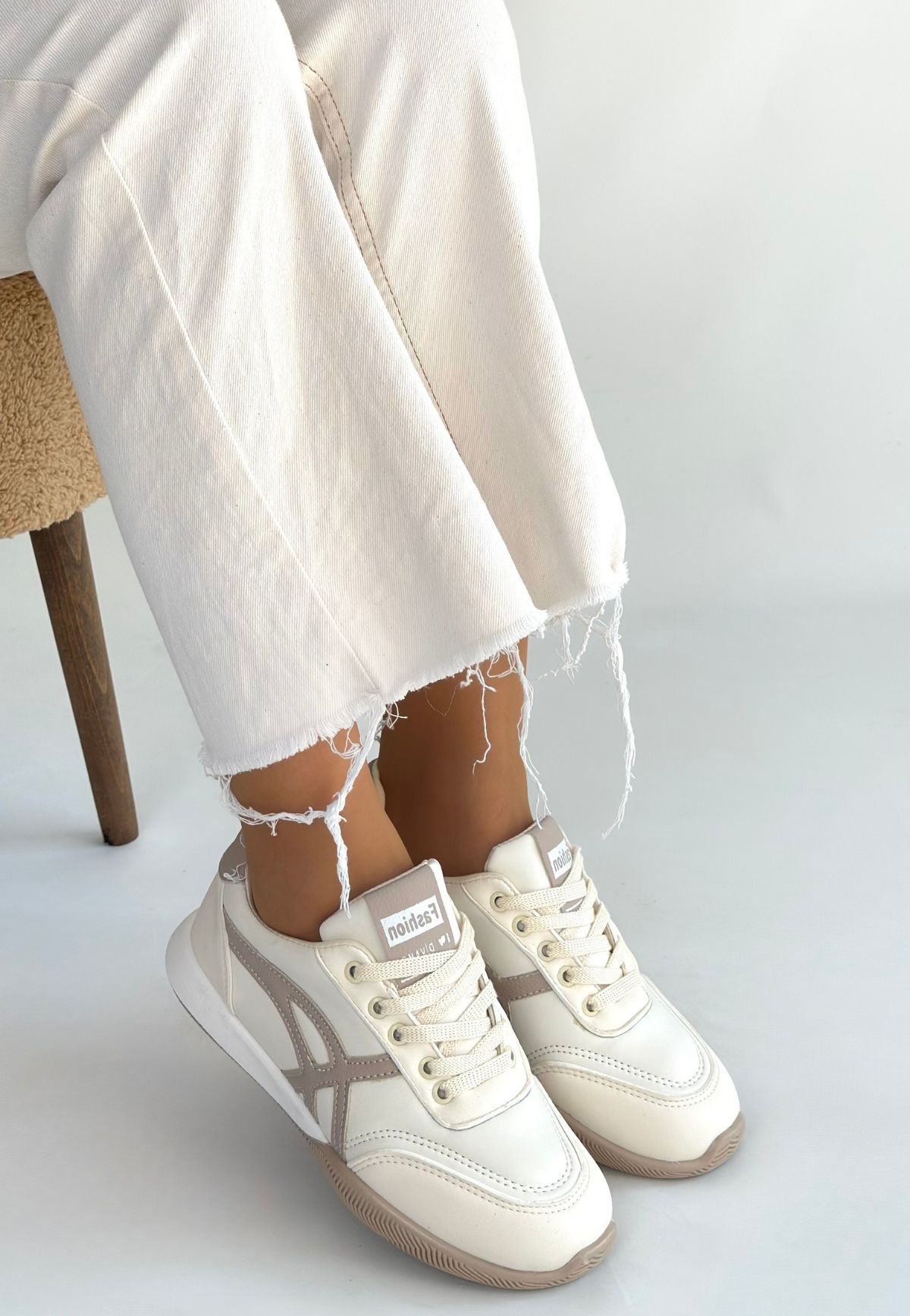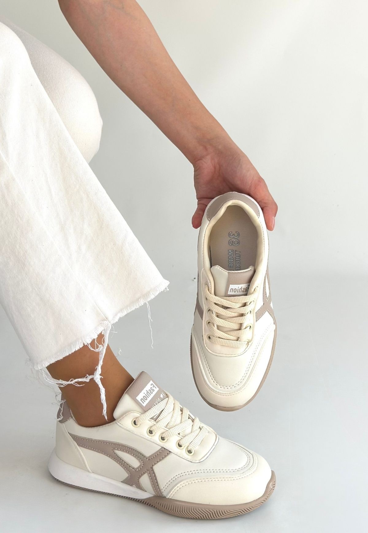 • Zlay Bej Cilt Vizon Detaylı Bağcıklı Spor Ayakkabı
