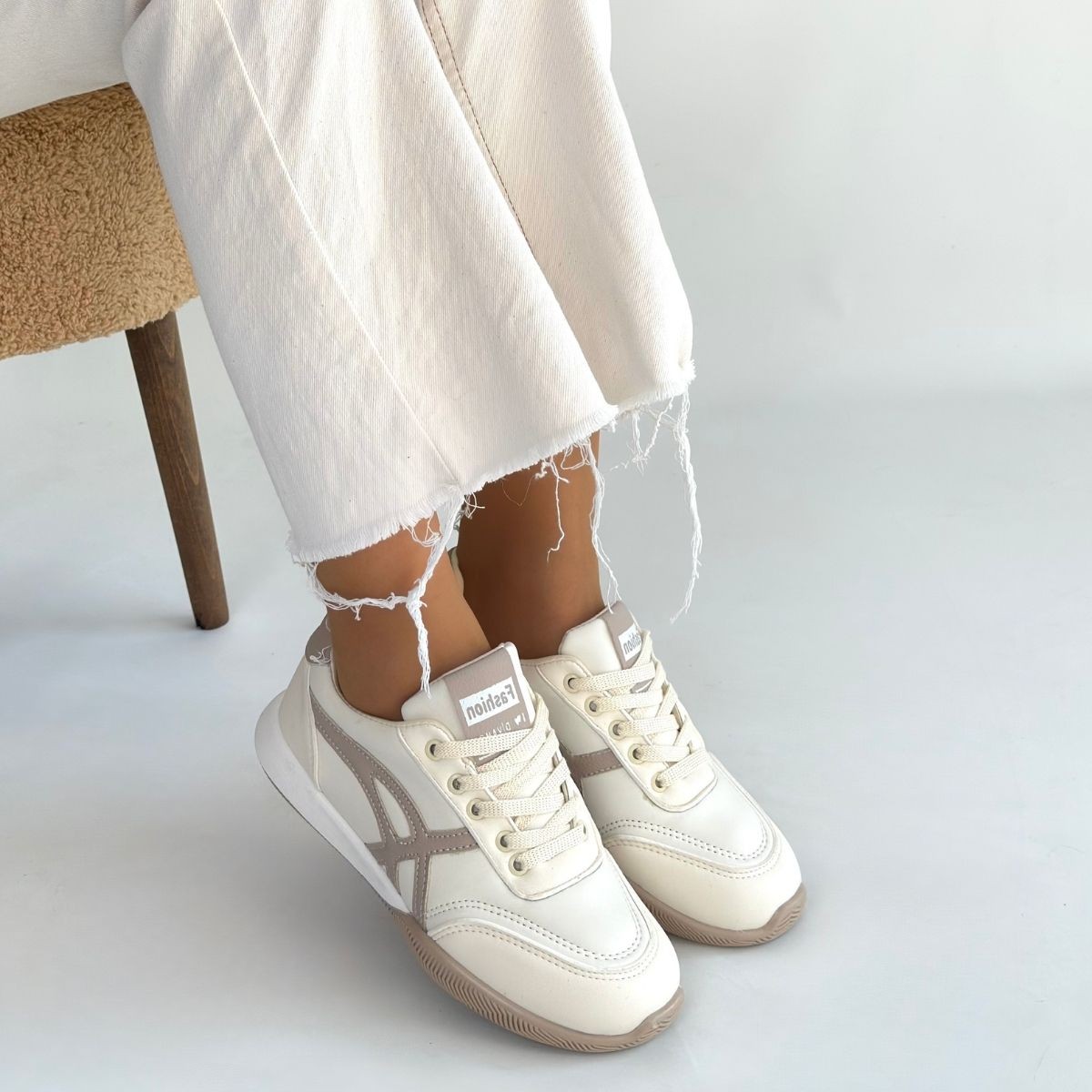 Zlay Bej Cilt Vizon Detaylı Bağcıklı Spor Ayakkabı