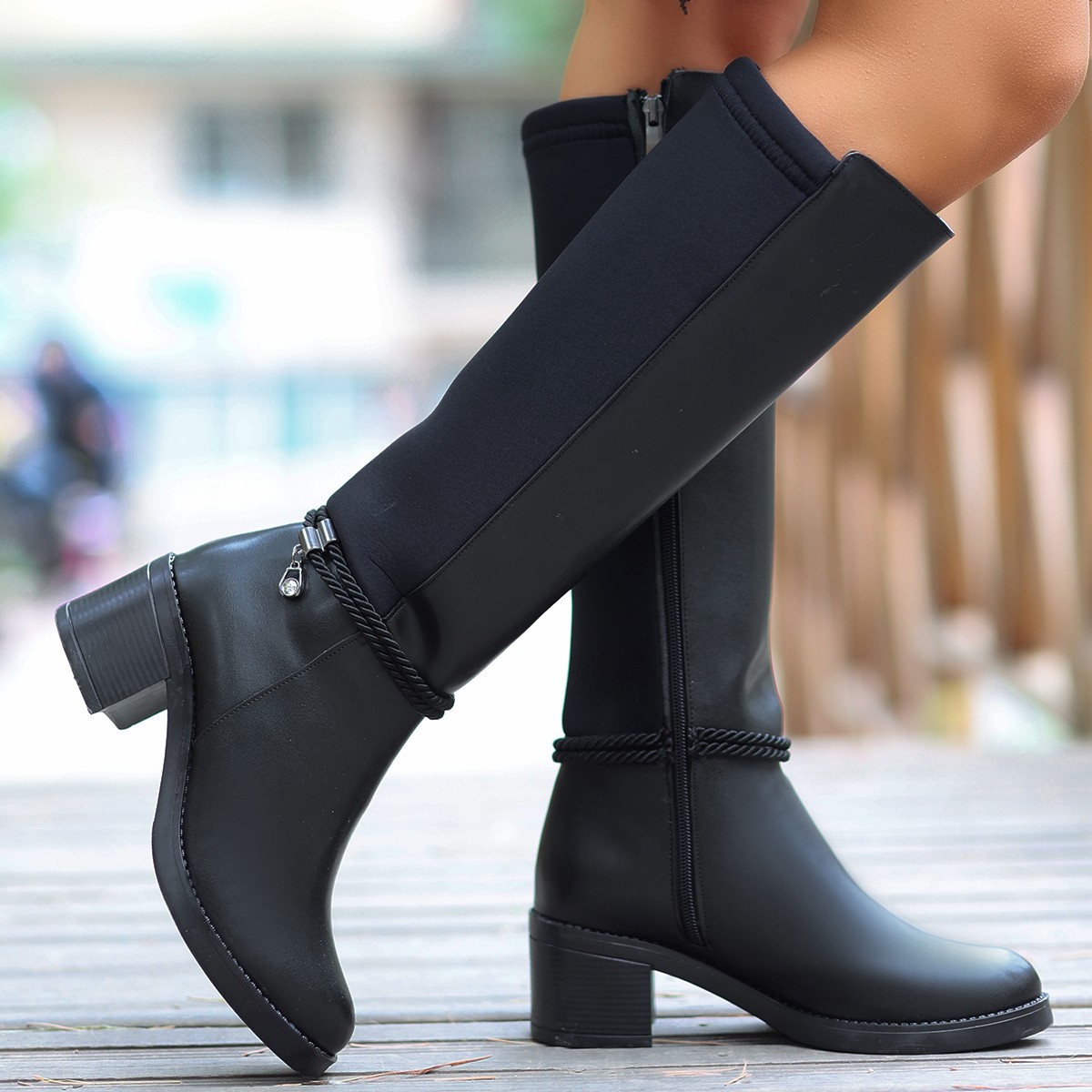 Detay: Topuklu Yandan Fermuarlı Arka Kısmı Streç Diz Altı Çizme