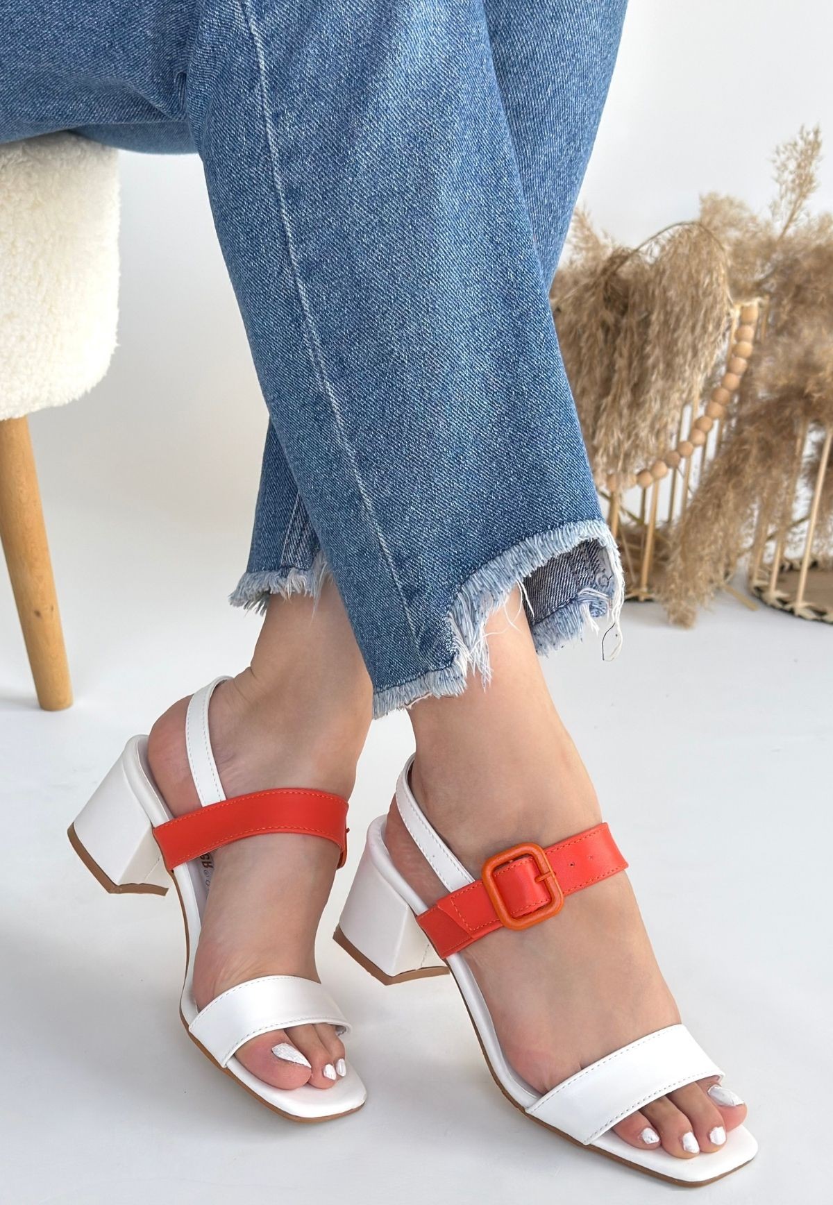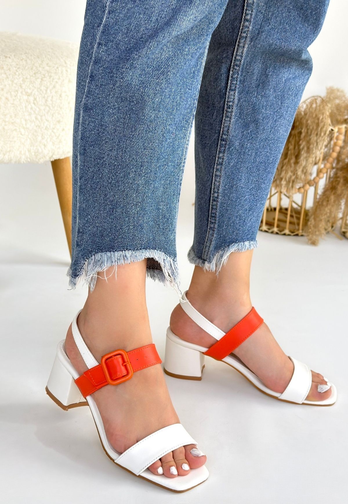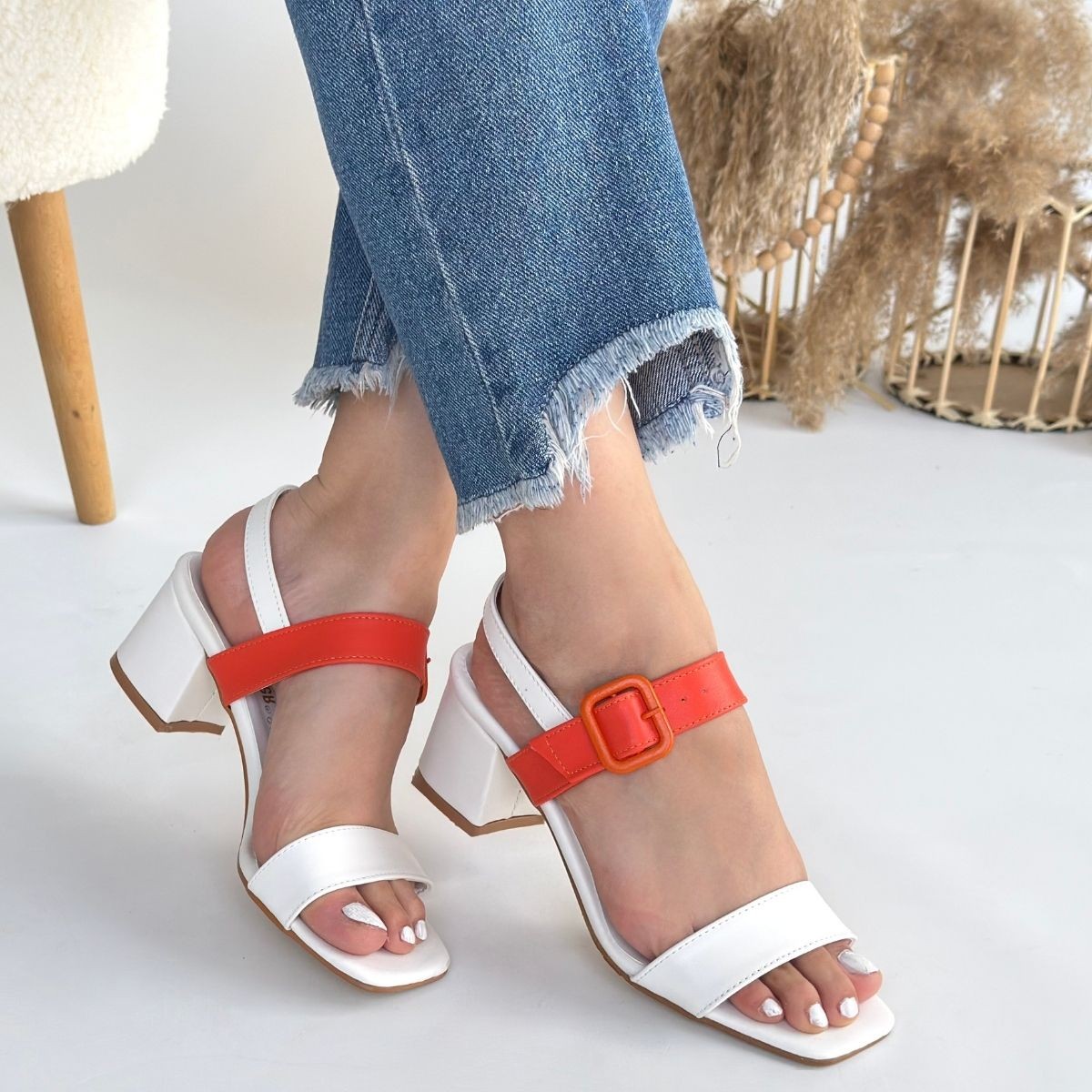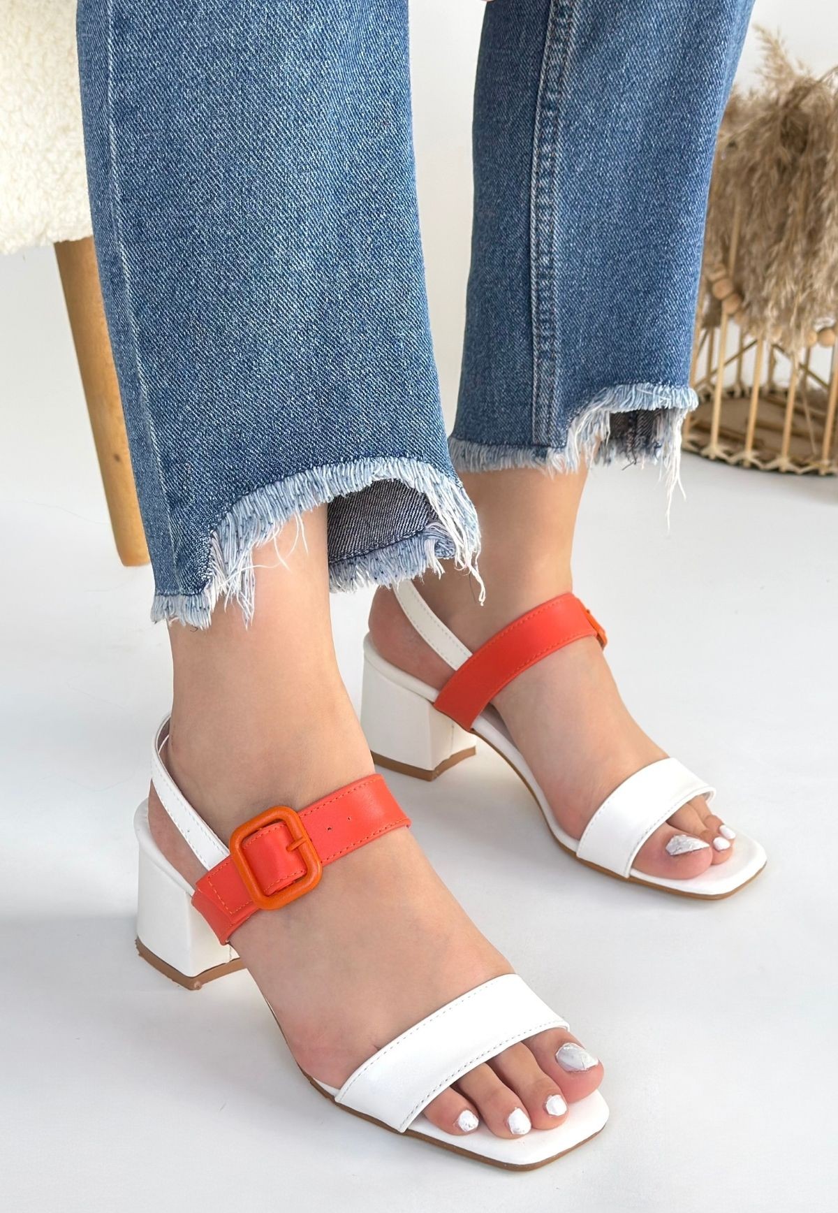 Topuklu Year Beyaz Cilt Turuncu Detaylı Beyaz Topuklu Ayakkabı